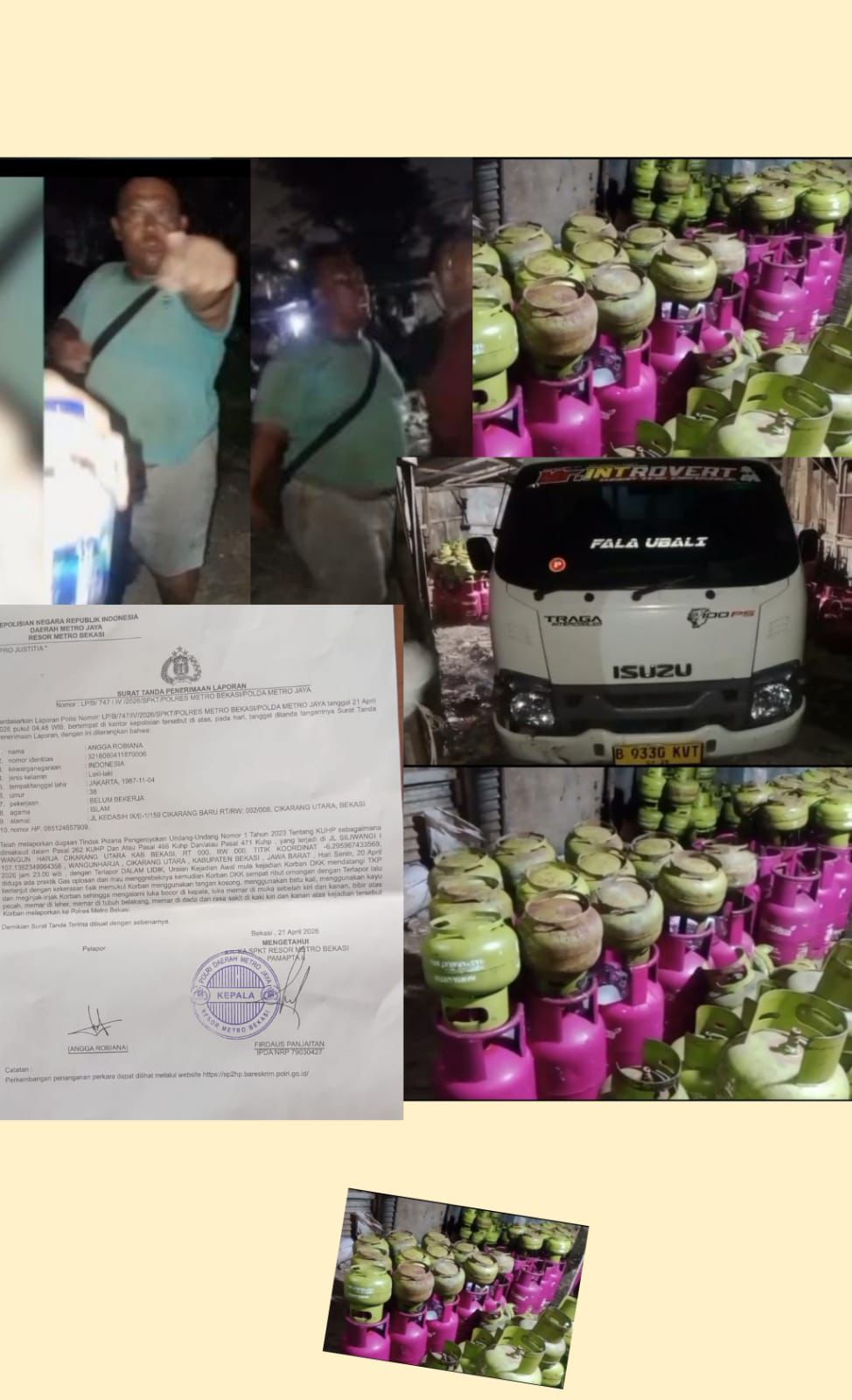 Keesok Hari nya awak Media melaporkan ke Polres Metro Bekasi untuk membuka Laporan Polisi adanya Tempat Pengoplosan Gas LPG yang berada di wilayah Kp. Bangkong Reang, Desa Wangun Harja, Kecamatan Cikarang Utara, Kabupaten Bekasi, dan Laporan Polisi tersebut telah di keluarkan dengan isinya sebagai berikut : Berdasarkan Surat Laporan Polisi No: B/ 747/ IV/ 2026/ SPKT/ Polres Metro Bekasi, bahwa Wartawan telah melaporkan kejadian dugaan Tindak Pengeroyokan, Undang – Undang No. 1 Tahun 2023, tentang KUHP sebagai mana dimaksud dalam Pasal 262 dan atau Pasal 466 KUHP dan Pasal 471 KUHP, yang terjadi di Jalan Siliwangi I, Kp. Bangkong Reang, Desa Wangun Harja, Kecamatan Cikarang Utara, Kabupaten Bekasi telah terjadi pada Hari Senin 20 April 2026 Jam 23-00, dengan Terlapor dalam “Lidik” dan uraian kejadian awal mulanya Korban dan kawan – kawan mendatangi TKP adanya dugaan praktik Pengoplosan Gas LPG mau menggerebeknya dan Korban sempat terjadi keributan dengan Pelaku/Terlapor, lalu terjadi Kekerasan fisik dan memukul Korban dengan tangan kosong, dan menggunakan Batu Kali serta menggunakan Kayu, bahakan Korban di injak – injak Pelaku sehingga mengalami Luka Bocor di Kepala serta Luka Memar di muka sebelah Kiri dan Kanan, serta Bibir atas Pecah bahakan memar di Leher, dan Belakang, Memar di Dada serta Sakit di Kaki Kiri dan Kanan sehingga Korban melaporkan ke Polres Metro Bekasi.