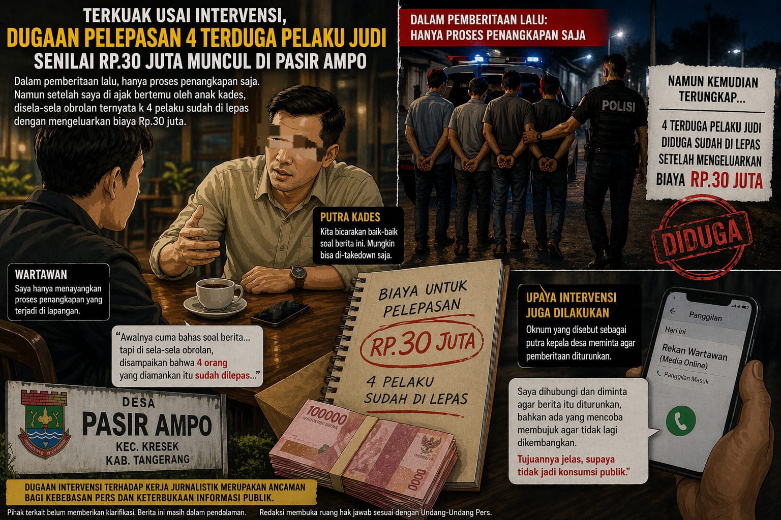 “Awalnya hanya membahas soal berita penangkapan yang sudah tayang. Namun di sela-sela obrolan, disampaikan bahwa empat orang yang sebelumnya diamankan itu sudah dilepas,” ujar wartawan yang meminta identitasnya dirahasiakan.
